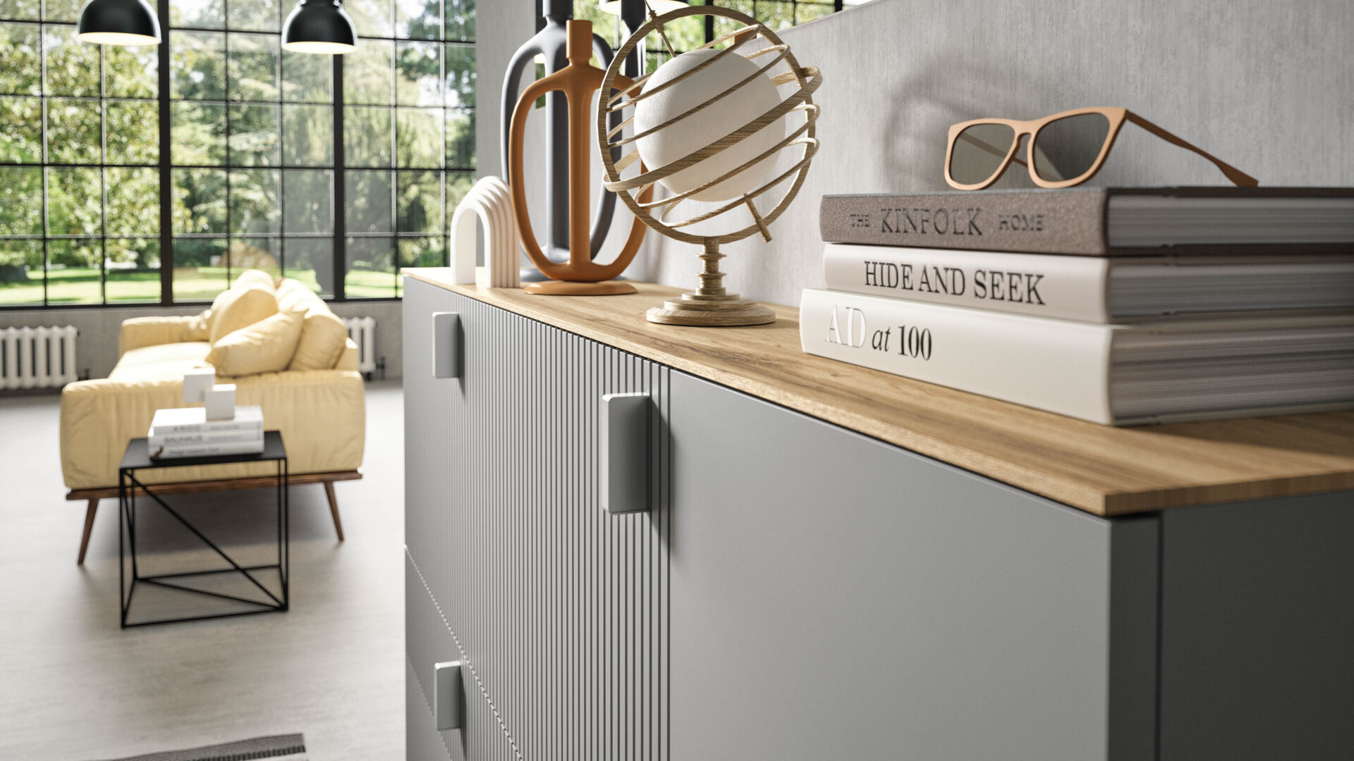 Cortina amazes with her refined design and essential architectures characterized by the striped detail on the front, a strong graphic sign that gives a precise identity to the furniture