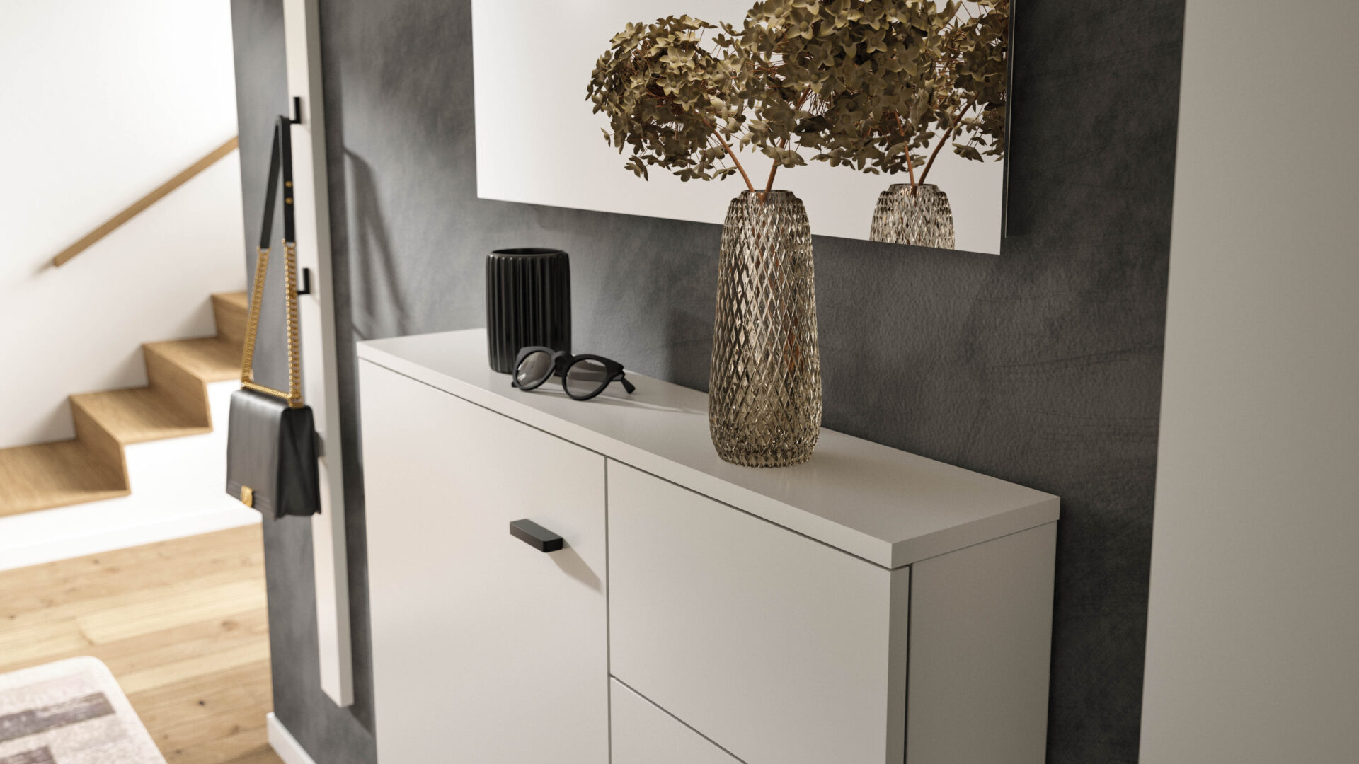 Wavy design and functionality combined to provide a refined and organised entrance in muted, matt colours.
